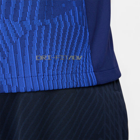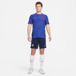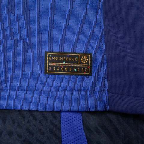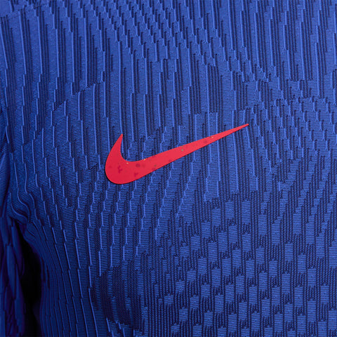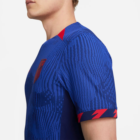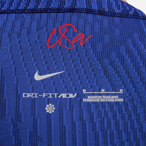The U.S. 2023 Away jersey is all about the stars and stripes. A patriotic red and blue colorway adds a touch of national DNA while details at the collar and sleeves pull inspiration from the points of a star to add bold style. Our Match collection pairs authentic design details with lightweight, quick-drying technology to help keep the world’s biggest soccer stars cool and comfortable on the field. Breathability The body-mapped data-driven pattern provides air flow and moisture-wicking technology where you need it most. Mobility The computer-generated cross-knit pattern combined with our most innovative materials, fit and construction methods provide unprecedented freedom of movement. Sustainability Each national team kit is composed of 100% recycled polyester fibers. More than 75% of the entire Nike Football apparel collection is made with 100% recycled polyester—a significant stride forward in sustainably-minded design in Nike Football.